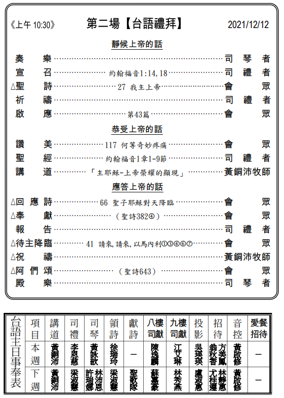 - 本主日(12/12)為待降節第三主日,以「喜樂」的心迎接主耶穌降臨。