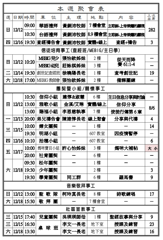 - 財務組:兄姊本年度若有奉獻計劃,請於12/26(日)前完成奉獻。本會各團契小組、機構之事工請於12/26(日)結帳,以利年度會計作業。