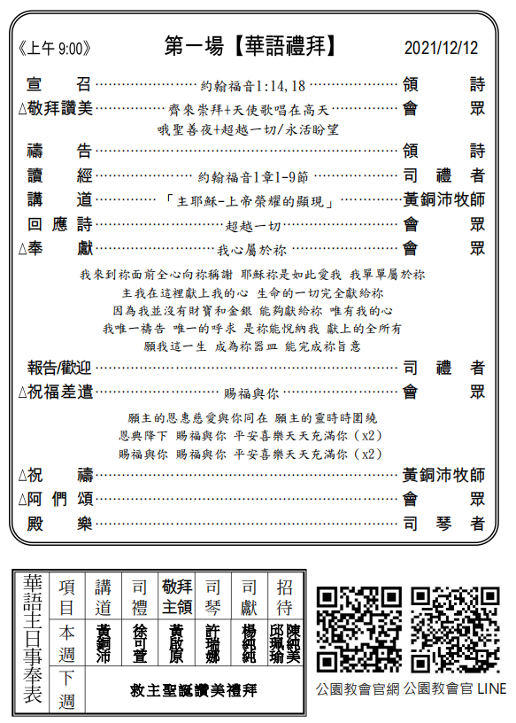 - 下週主日(12/19)上午10:30舉行救主聖誕聯合讚美禮拜,歡迎兄姊蒞臨,齊心頌讚救主耶穌降臨。詩歌讚美/聖歌隊-「主如明亮晨星」,敬拜讚美-公園教會敬拜團;獻詩-MEBIG主日學。