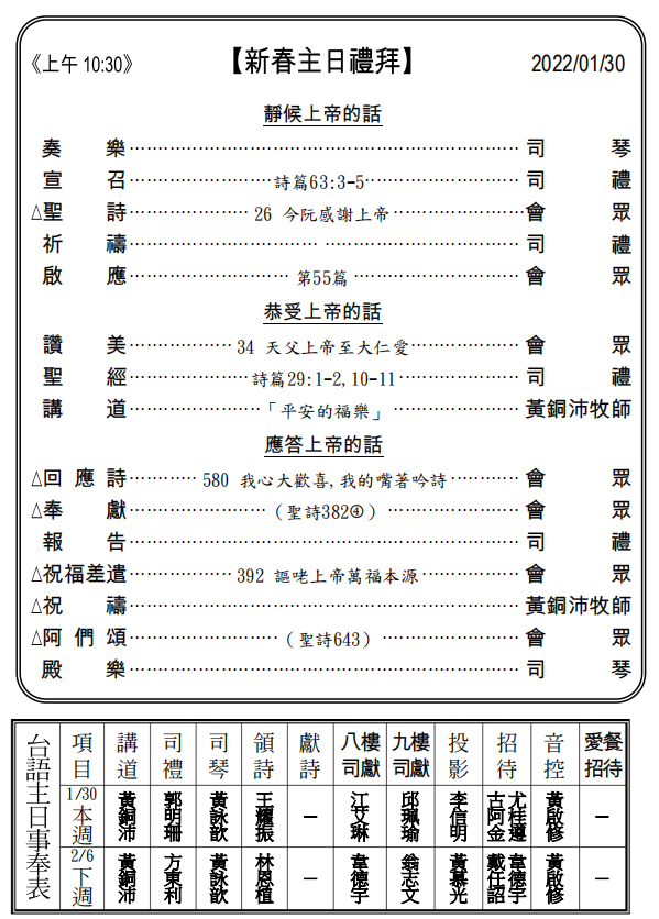 ◎下週主日迎春團拜聯合禮拜預告(2月6日)上午10:30