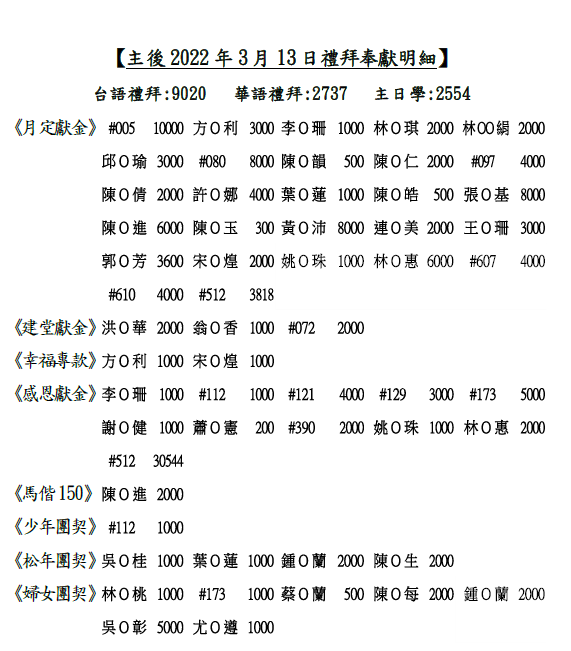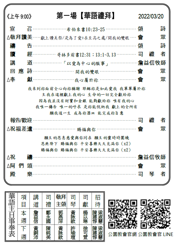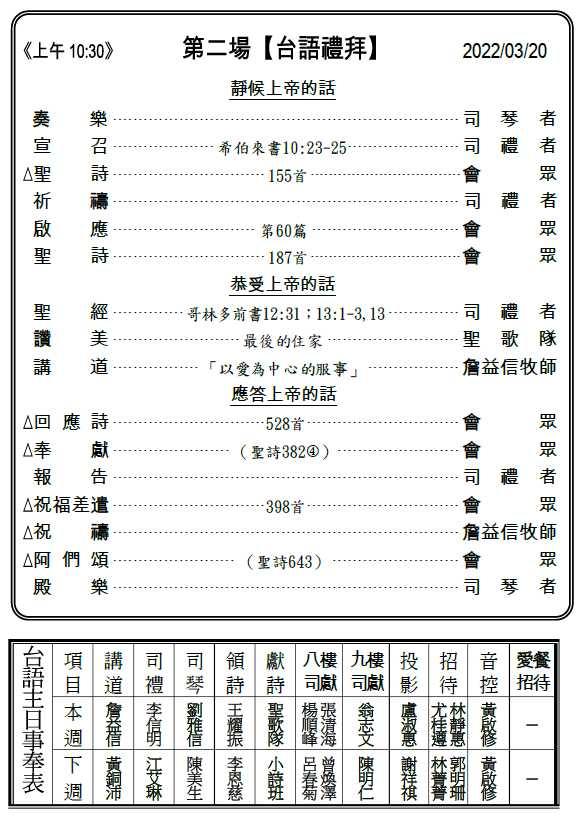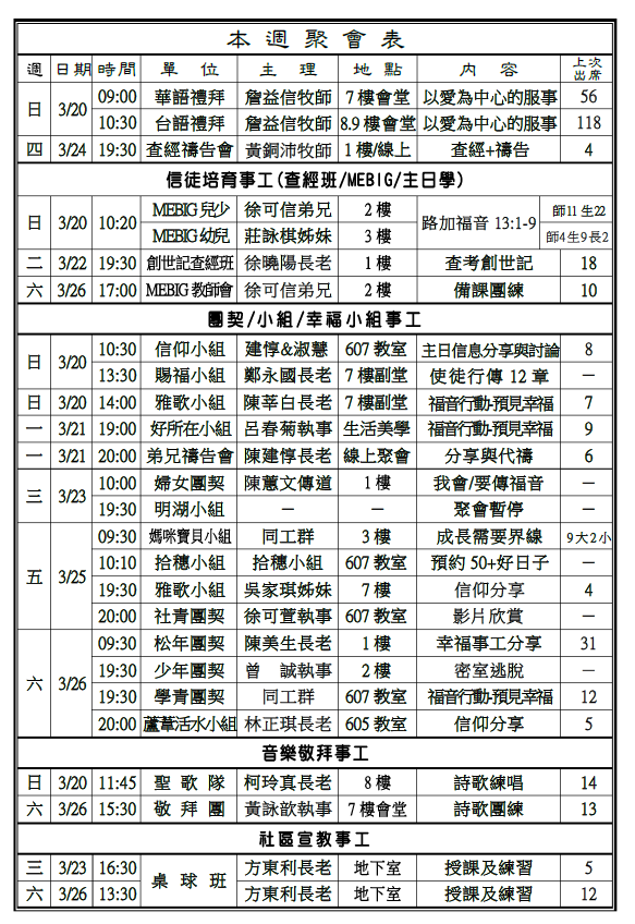 1. 本主日(3/20)為台南神學院奉獻主日,詹益信牧師代表南神於兩堂禮拜講道請安,請兄姊為南神關心奉獻。(本日黃牧師代表南神前往新竹教會)