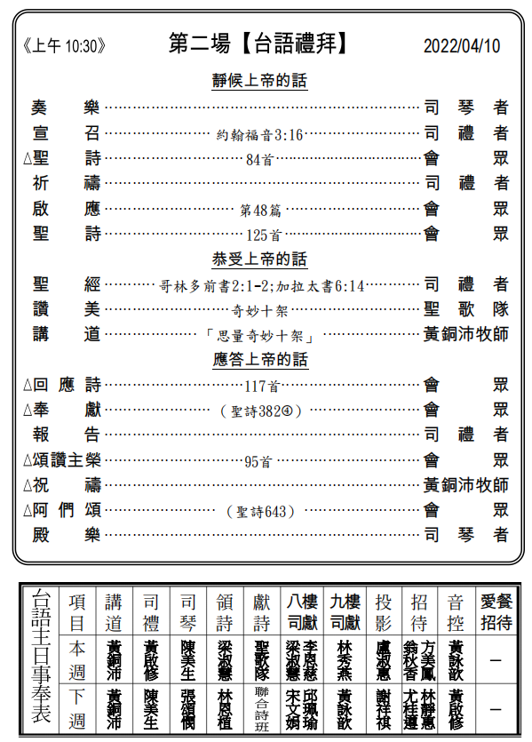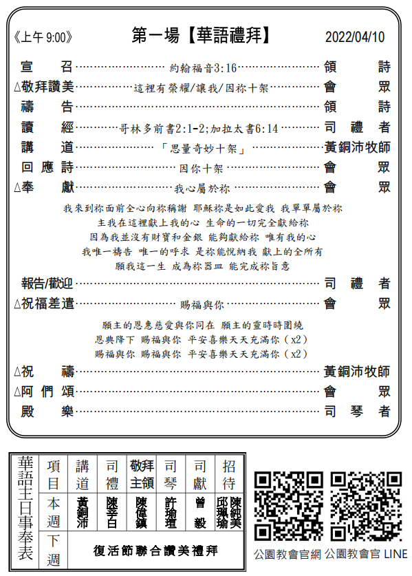 2. 下週主日(4/17)為復活節,兩堂禮拜聯合舉行,時間/上午10:30。