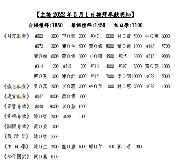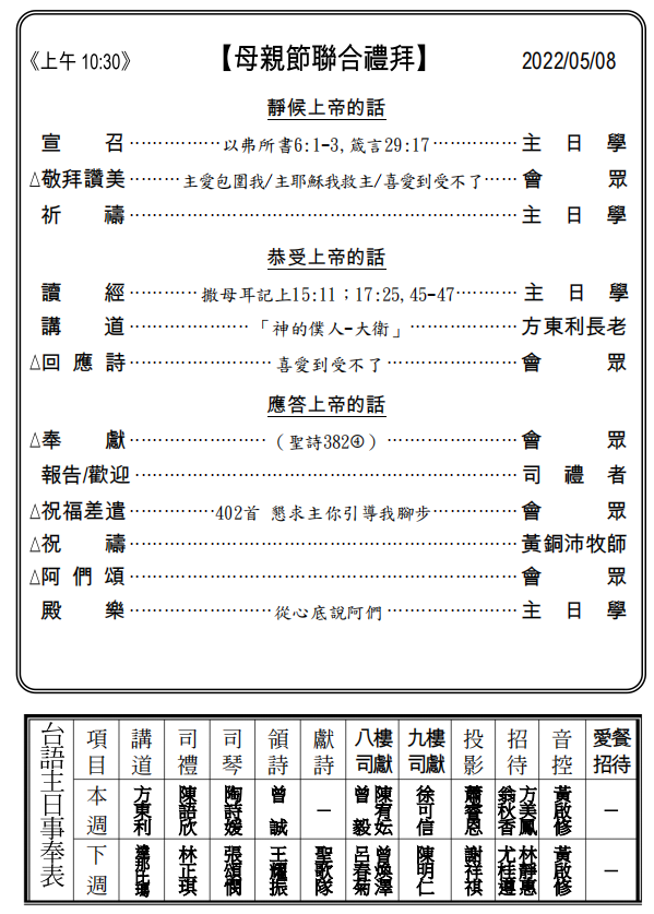 ◎下週主日禮拜預告(5月15日) ※玉神奉獻主日