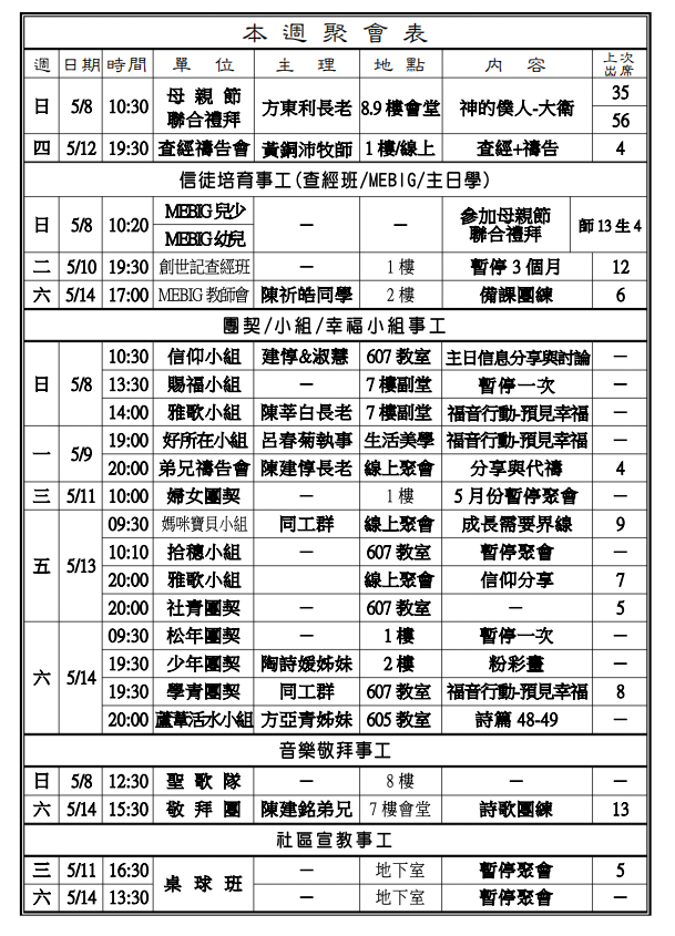 4)配合幸福小組事工,5/29兩堂禮拜舉行福音主日,邀請詹俊裕長老講道見證,歡迎慕道友和BEST參加福音主日。