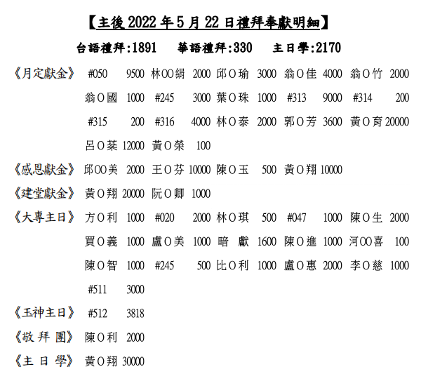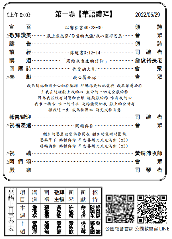 1.黃彥儒執事5/10(二)因胰臟癌安息主懷,已於5/18(三)舉行火化及樹葬禮拜,願聖靈安慰遺族及眾親友。