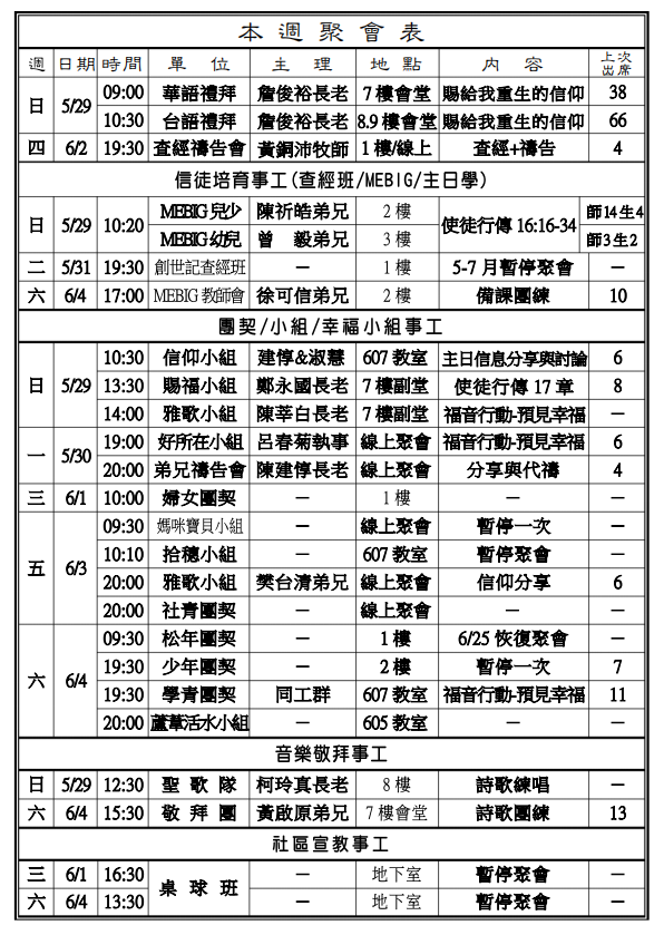◎下週主日兩堂禮拜預告(6月5日)