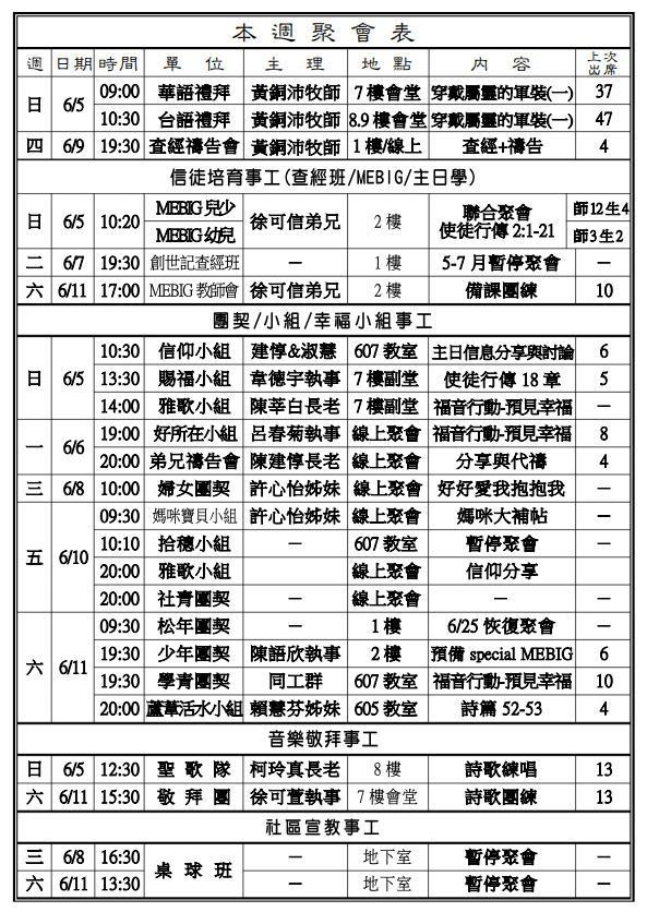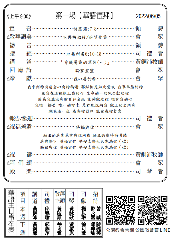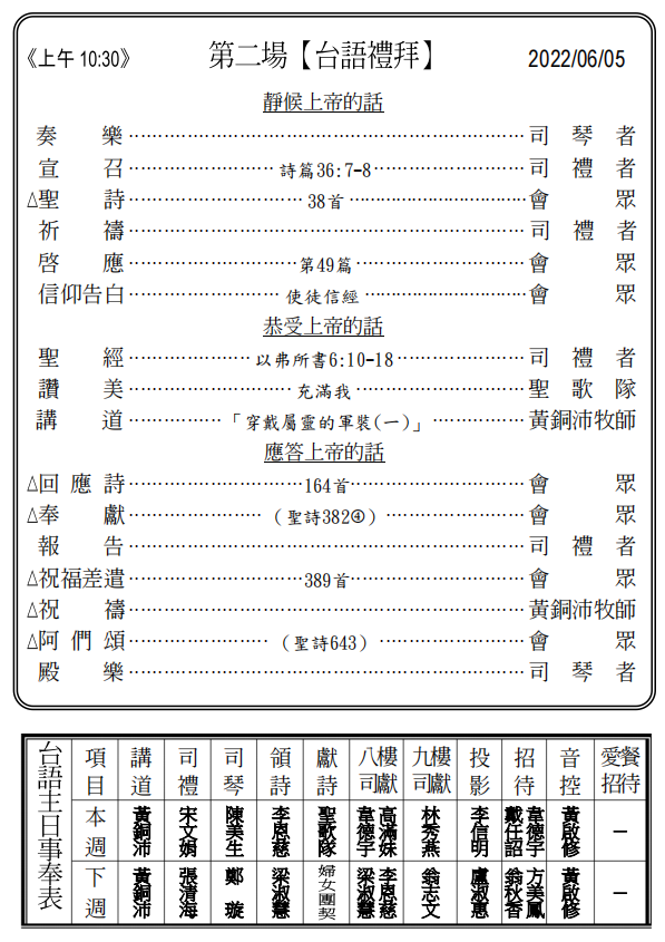 6/12(日)兩堂禮拜,講道:黃銅沛牧師