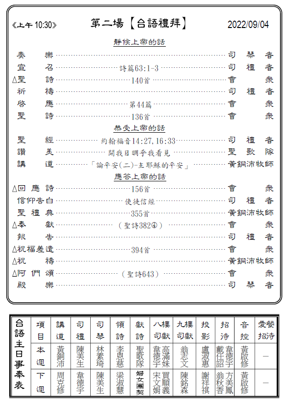 - 本主日(9/4)兩堂禮拜中舉行聖禮典,請兄姊預備心參加。