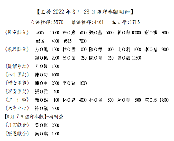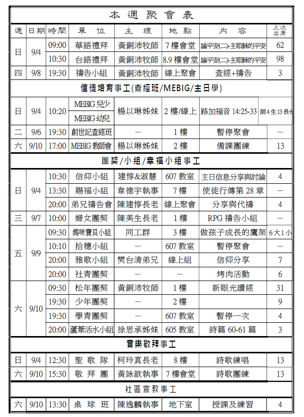 - 松年團契9/14-15舉辦靈修之旅,景點/溪頭週邊,報名費3000元/人(契友補助500元),請向買順義執事報名。
