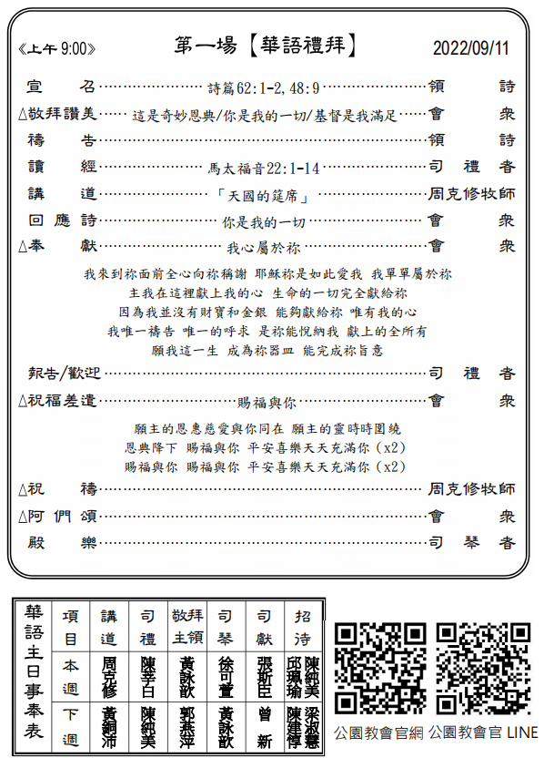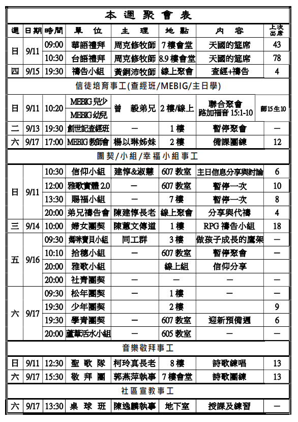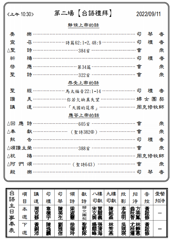 ◎下週主日兩堂禮拜預告(9月18日)
