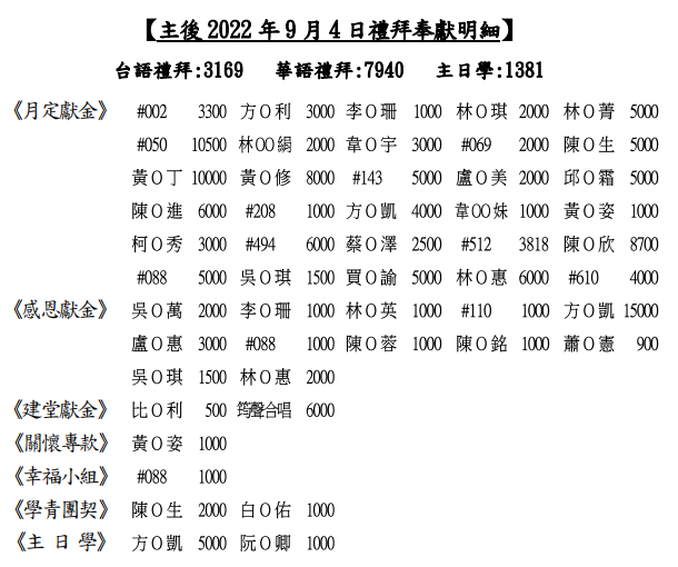 1.鄭羅阿庭老姊妹9/5(一)安息主懷,旅世百歲,願上帝安慰家屬並賜福。訂9/16(五)上午9:30於新竹市生命園區追思廳舉行告別+火化禮拜,下午骨灰安奉北莊福園。(鄭永國長老之母,居住香山仙樂園安養中心)