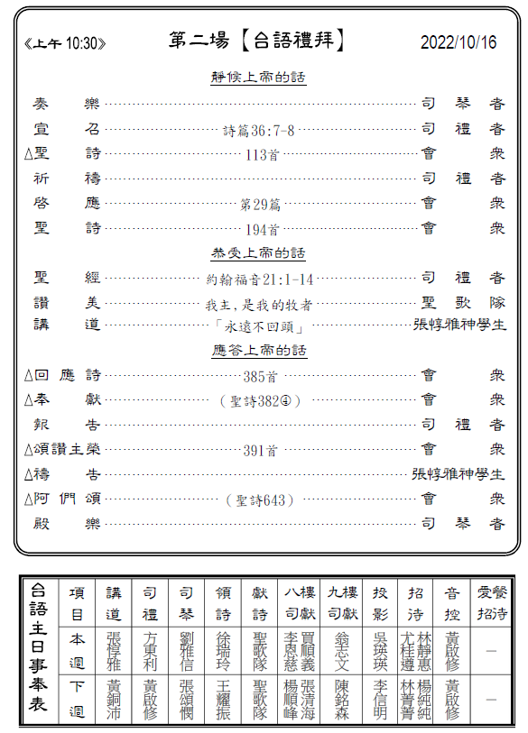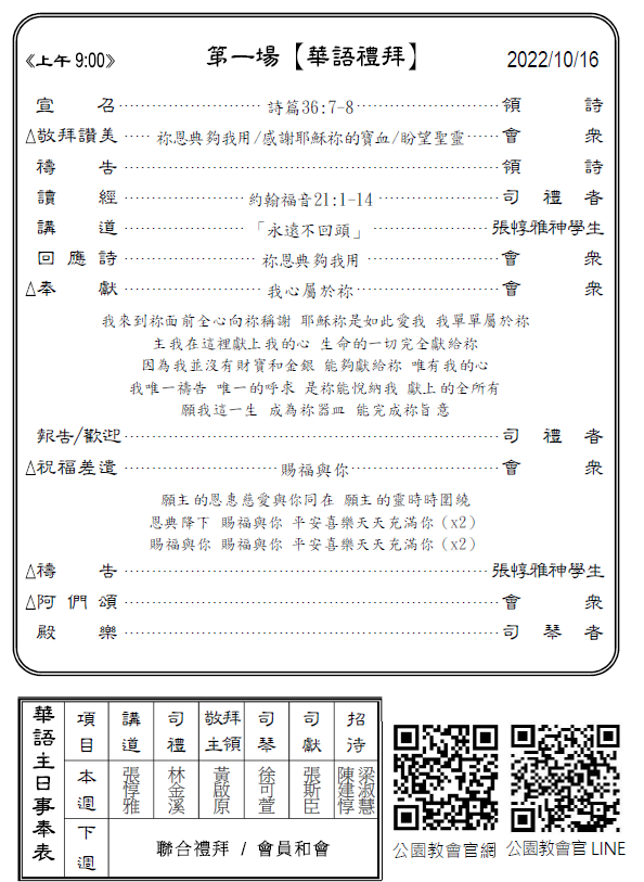 ◎下週主日聯合禮拜預告(10月23日)上午10:00 ※會員和會