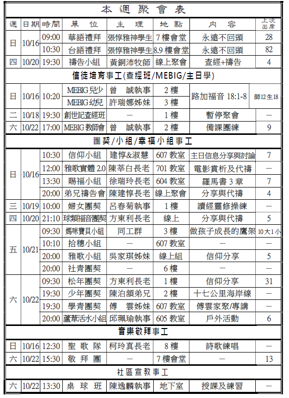 ♦雅歌幸福小組(公園下午茶):10/16(日)起每週日下午2:00於607教室舉行。