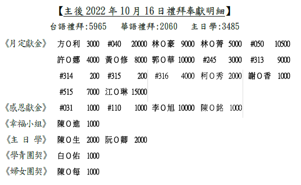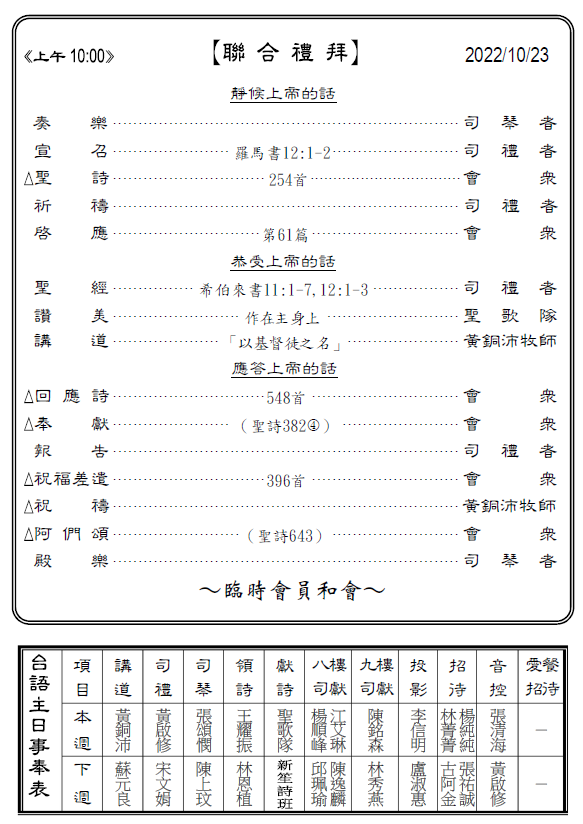 2.本會劉效先執事之夫人徐翠憶姊妹10/17(一)安息主懷,已於10/20(四)在新竹市生命園區舉行入殮火化禮拜,願主安慰遺族。