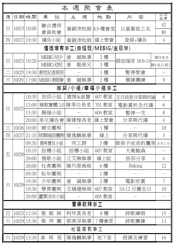 ♦雅歌幸福小組(公園下午茶):10/23(日)下午2:00於607教室舉行(第二週)。