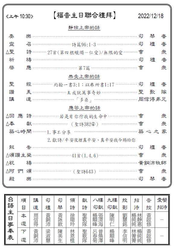2023/1/15(日)聯合禮拜 講道/黃銅沛牧師 ※定期會員和會