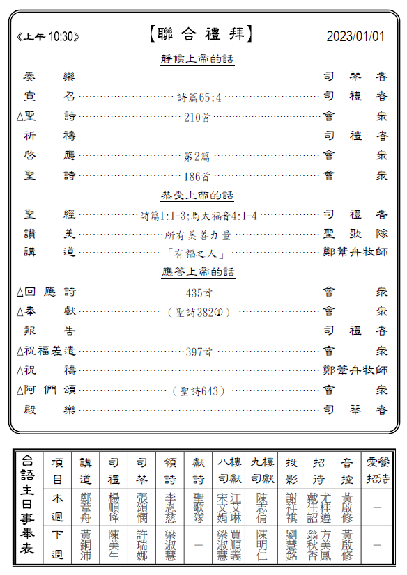 2023/1/15(日)聯合禮拜 講道/黃銅沛牧師 ※定期會員和會