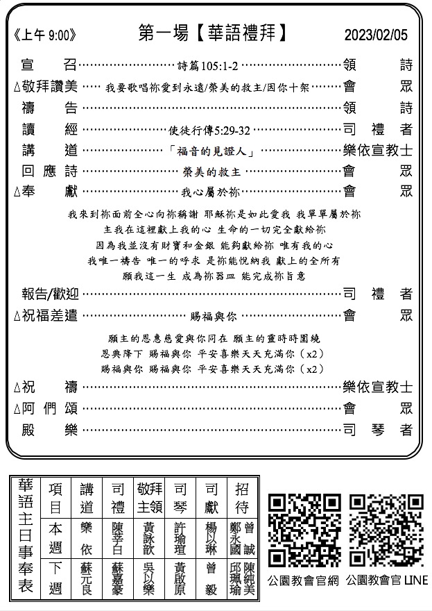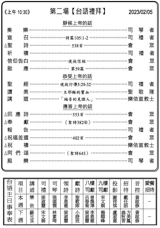 下週主日兩堂禮拜預告(2月12日)