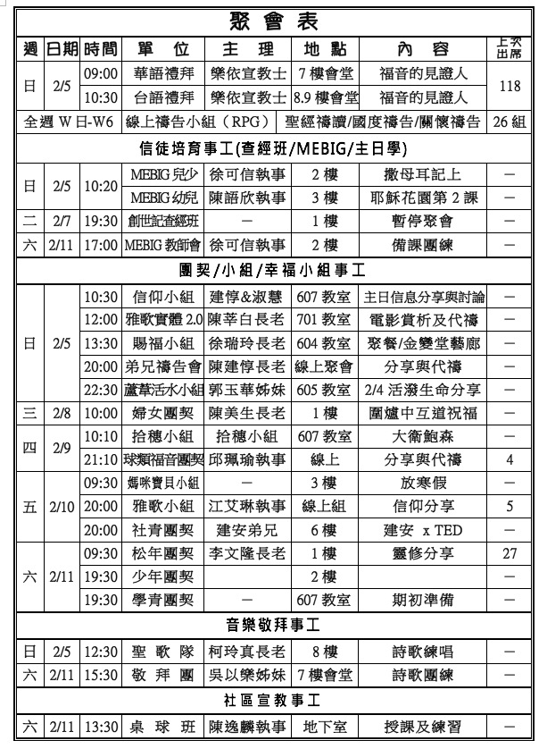 1. 本主日(2/5)歡迎樂依宣教士於兩堂禮拜中講道,並分享宣教事工。