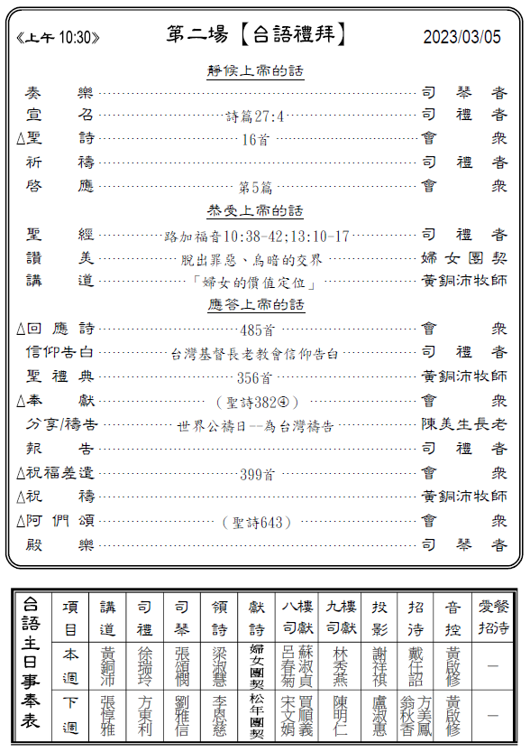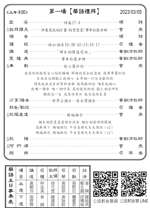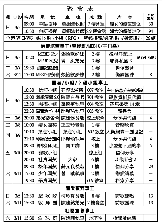 1. 本主日(3/5)兩堂禮拜中舉行聖禮典,請兄姊預備心參加。