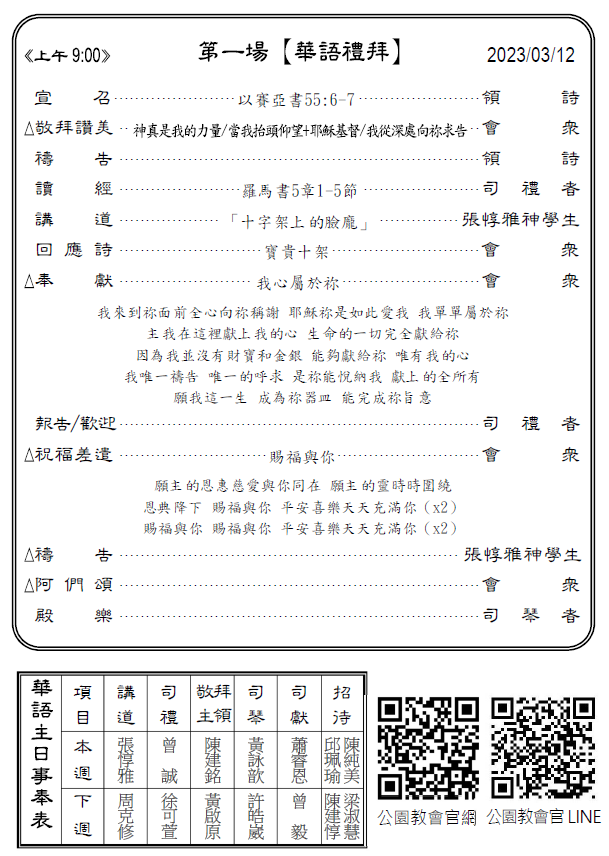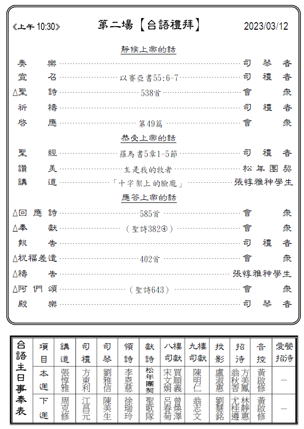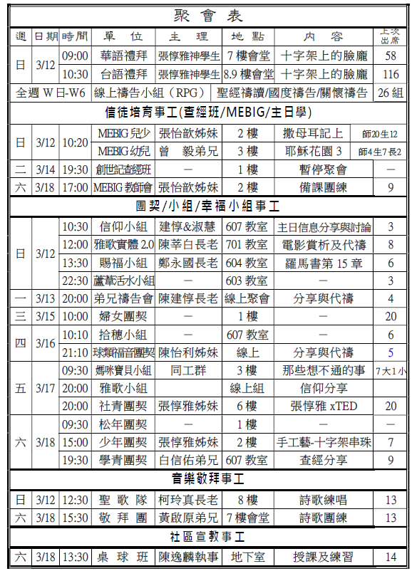 ※本主日(3/12)黃牧師前往南寮教會主理禮拜及聖禮典。