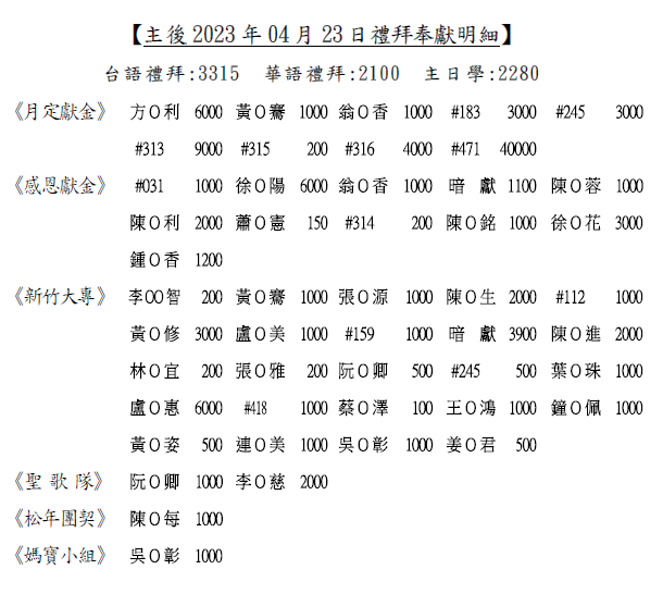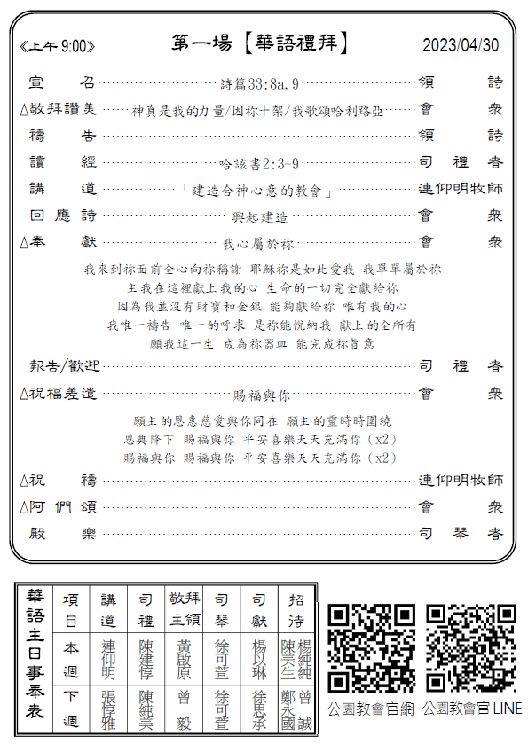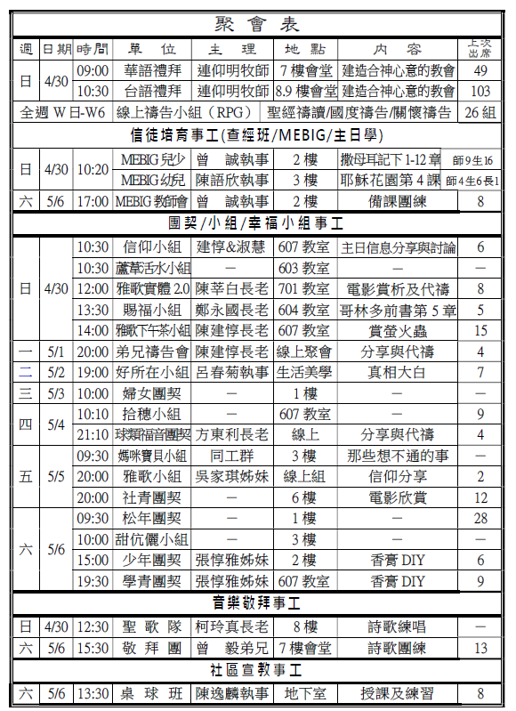 1.本會蔡宜倫姊妹4/25(二)安息主懷,各場次禮拜於5/4(四)舉行。