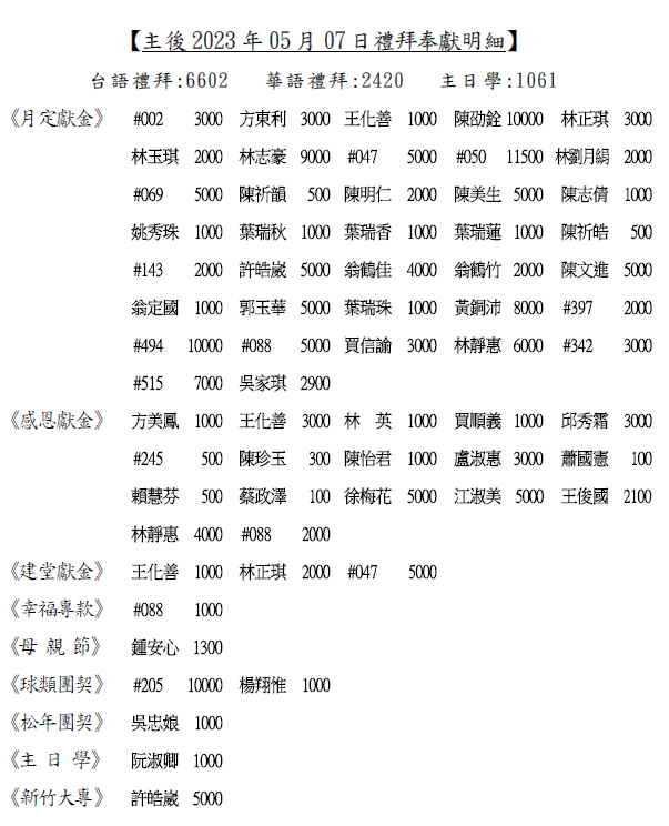 - 上週聖禮典陪餐者:台語102名,華語43名。