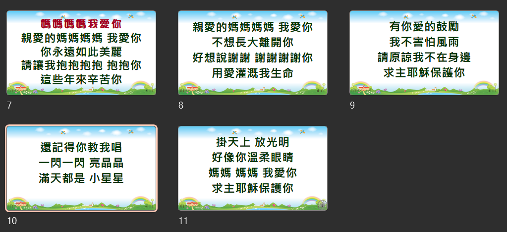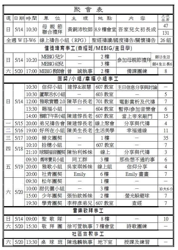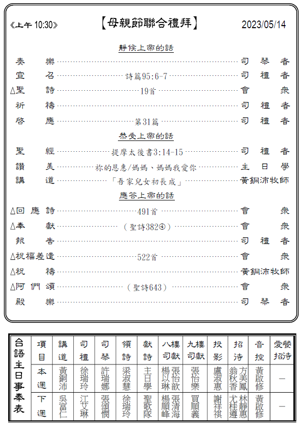 - 本主日(5/14)舉行母親節聯合感恩禮拜,兩堂禮拜合併舉行,歡迎兄姊闔家蒞臨參加禮拜。箴言廿二章6節「母親的教悔,在幼童心中形成天性,就是到老,他也不偏離。」