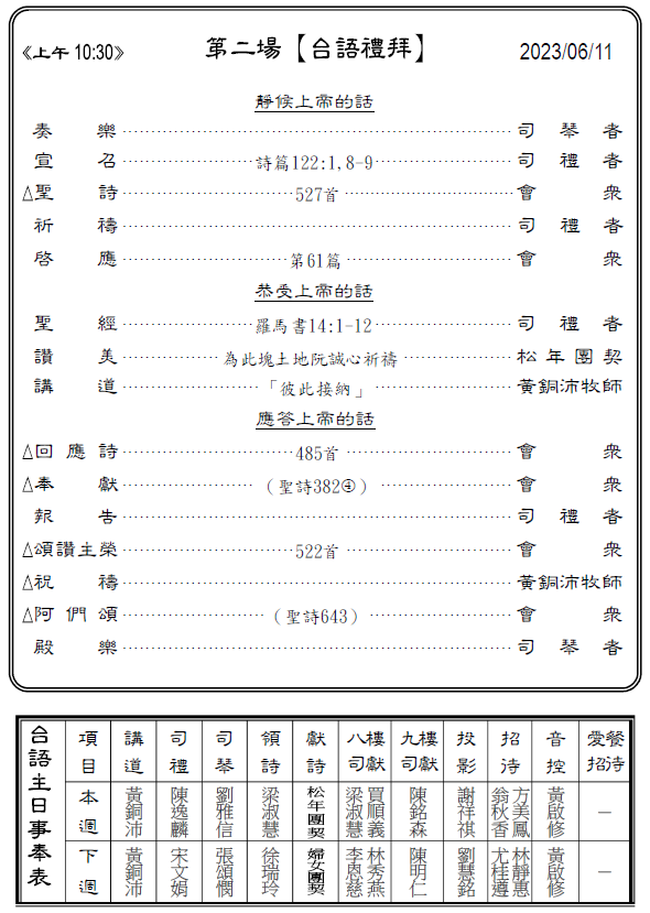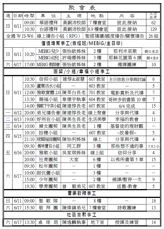1. 本主日(6/11)台語禮拜後(12:20)於七樓副堂召開長執會,請長執直接到七樓用餐及開會。敬備便當及茶點。