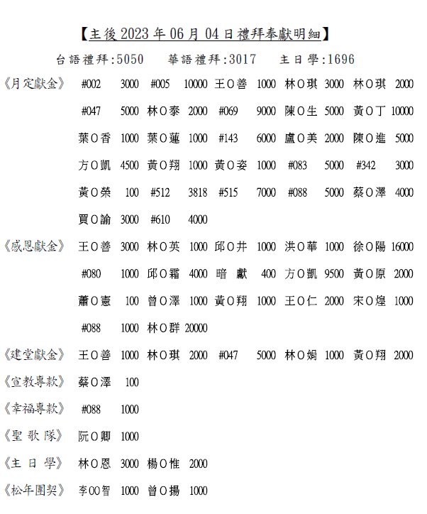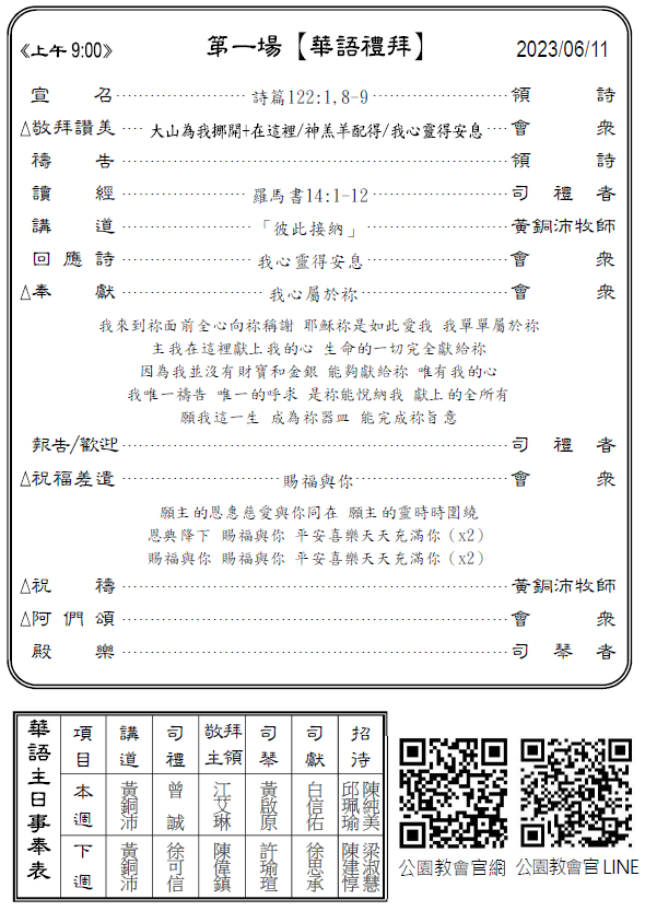 2. 近期聖禮典預定7/2(日)兩堂禮拜中舉行,欲受洗的兄姊請向李玉珊幹事報名,以安排受洗課程。(成人洗禮/小兒洗禮/堅信禮/會籍轉入)