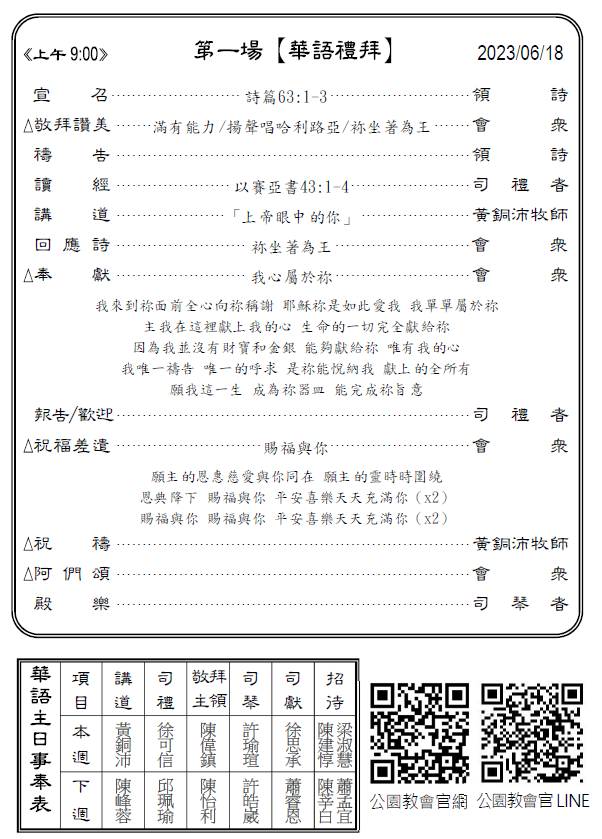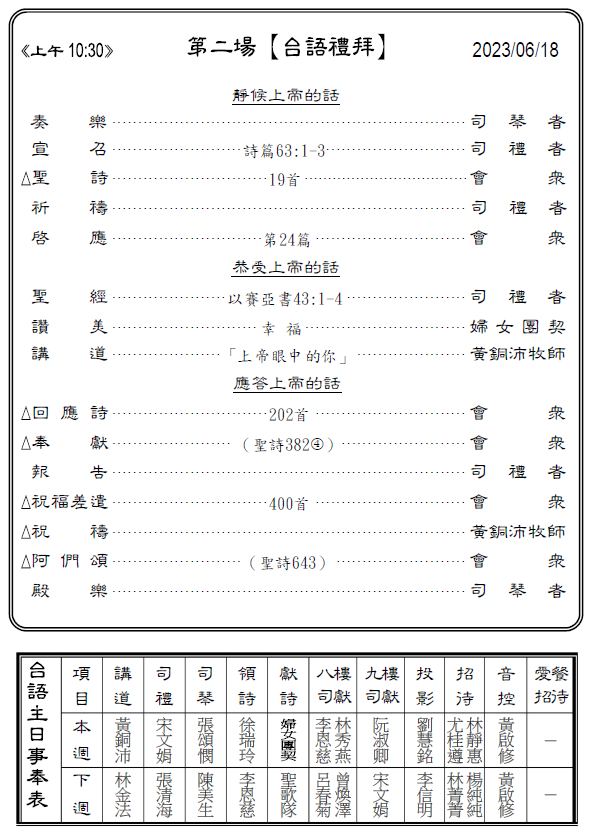 3)每週主日安排輪值長老及執事,協調主日事工。