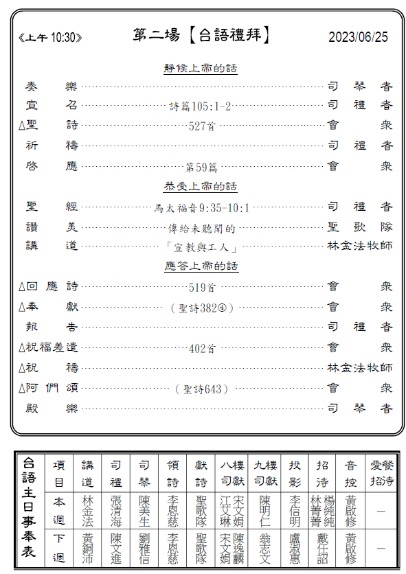 宣召=詩篇62:1-2 啟應=第19篇 聖詩=179,615,363,398