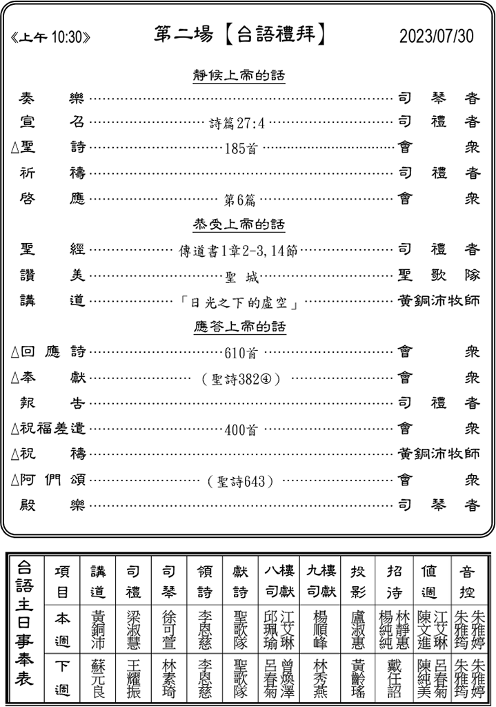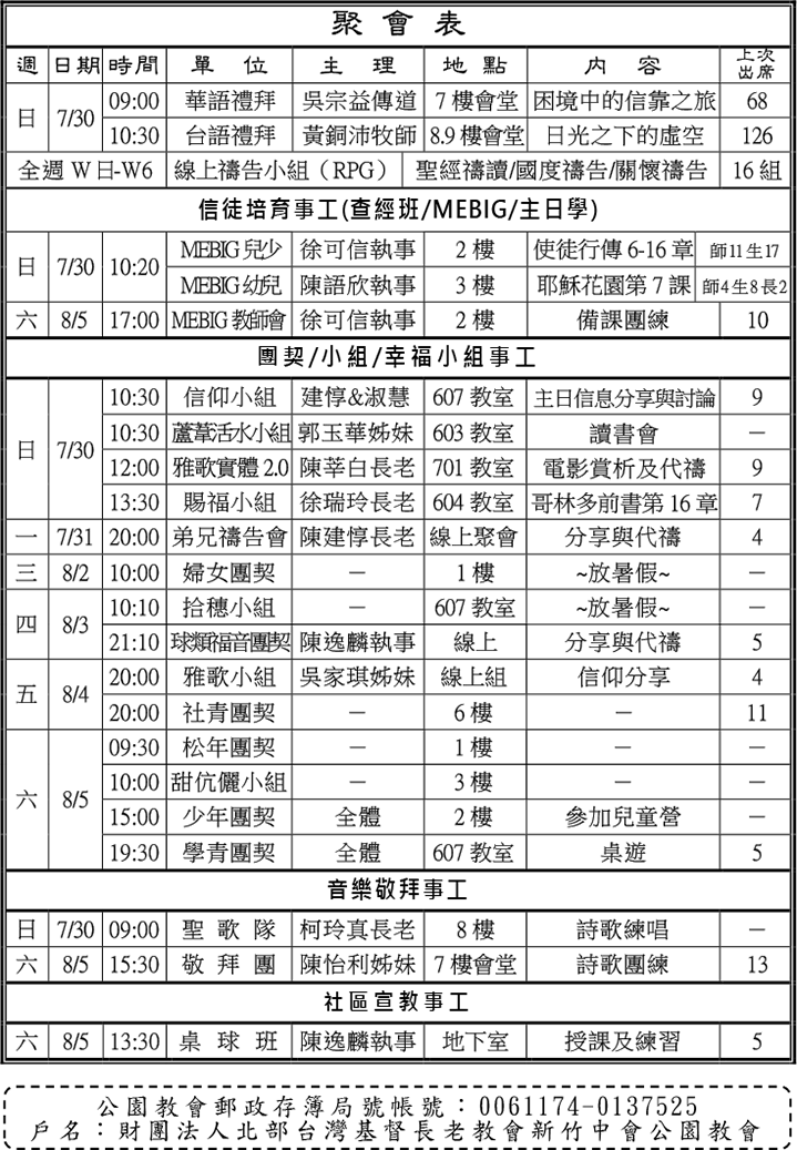- 新竹區MEBIG兒童營會8/3-5在聖經書院舉行,本會MEBIG主日學共同承辦。本主日(7/30)華語禮拜中舉行差遣祝福禱告。-林金溪長老