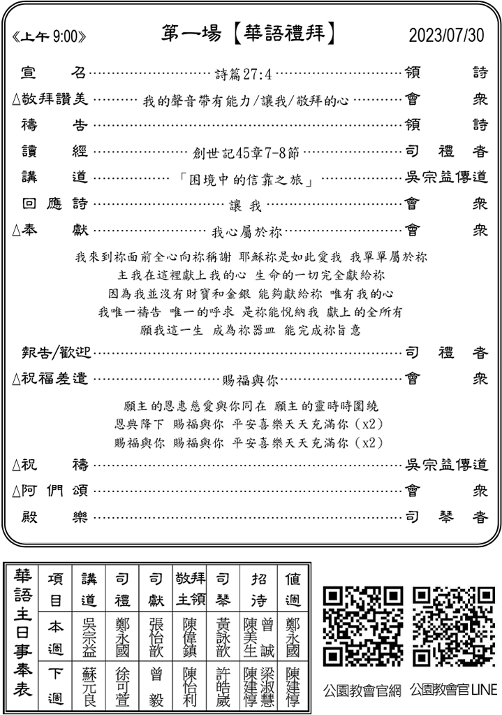 - 本主日(7/30)歡迎吳宗益傳道於華語禮拜講道。