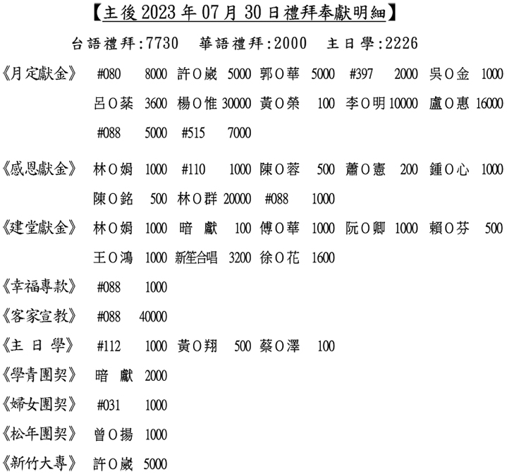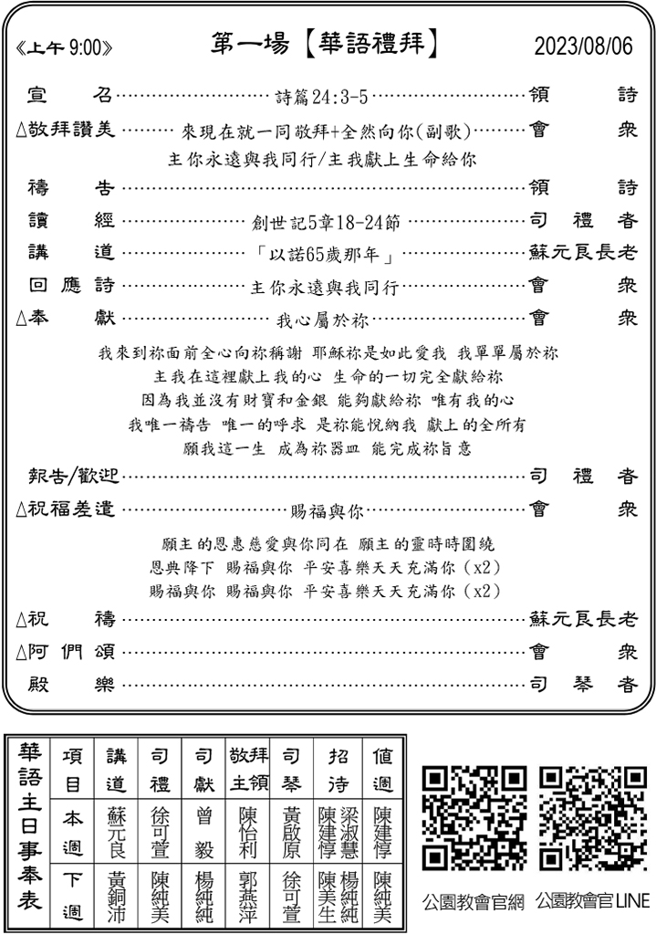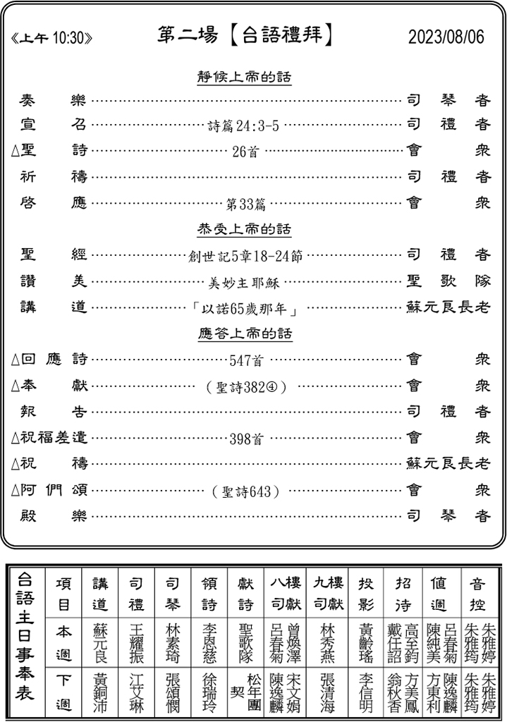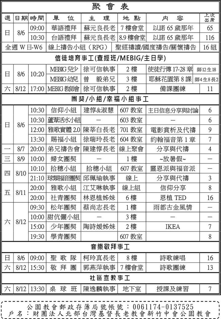 - 本主日(8/6)感謝蘇元良長老於兩堂禮拜中講道。※本主日黃牧師前往南寮教會講道+主理聖禮典。