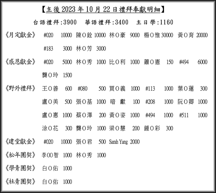 1. 亞洲教會婦女協會11月初於聖經學院舉行特會,總會11/5(日)安排8國10名與會外賓參加本會台語禮拜,本會將安排接待事宜。