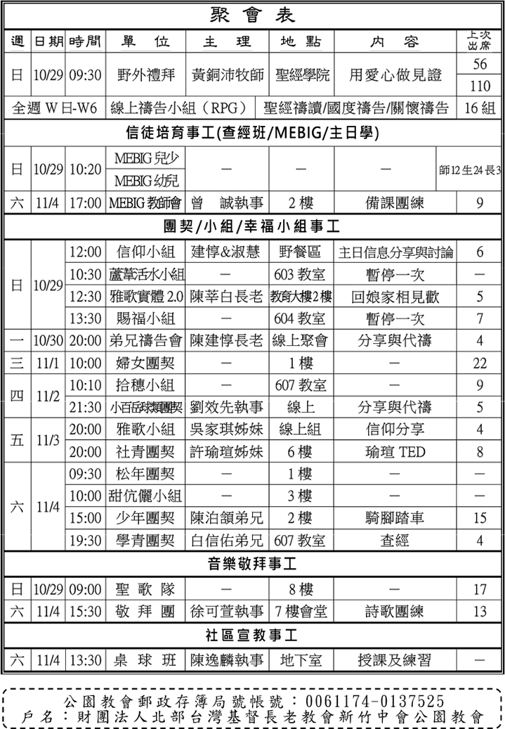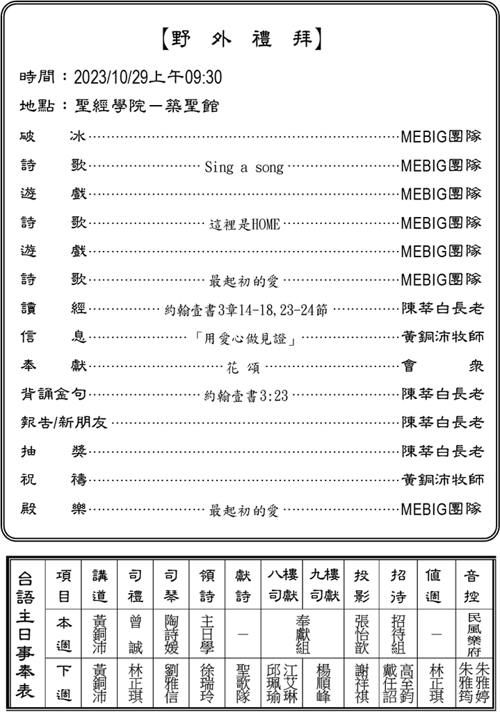 1. 本主日(10/29)於聖經學院築聖館舉辦野外禮拜,時間/9:00-14:00。