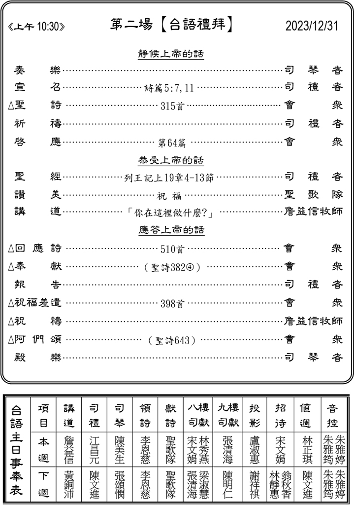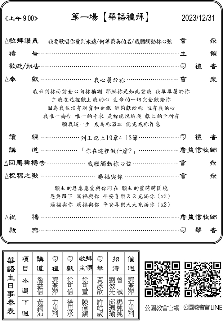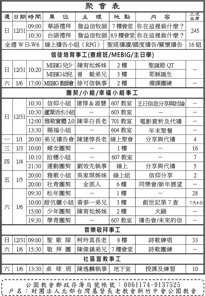 下週主日兩堂禮拜預告(1月7日) ※聖禮典&長執及首長就任