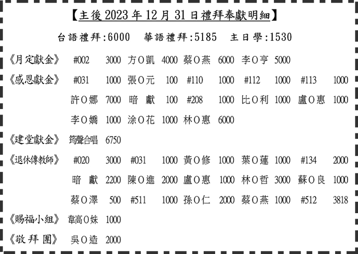 - 本主日(2024/1/7)兩堂禮拜中舉行聖禮典,成人洗禮:李淩峯、藍麗琴(台語);小兒洗禮:曾好(華語);信仰告白:陳劭銓(台語)。