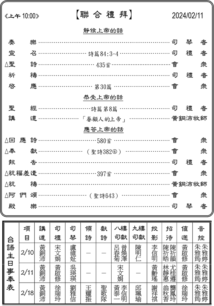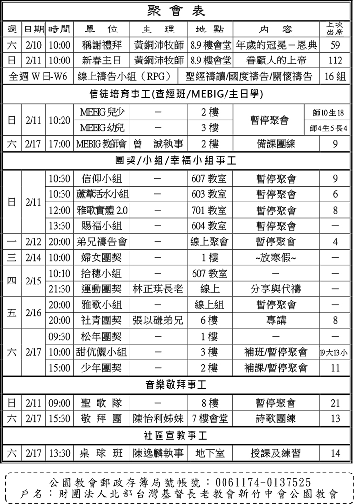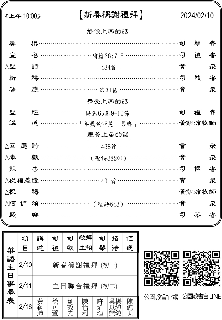 新春稱謝聯合禮拜(2月10日 禮拜六)