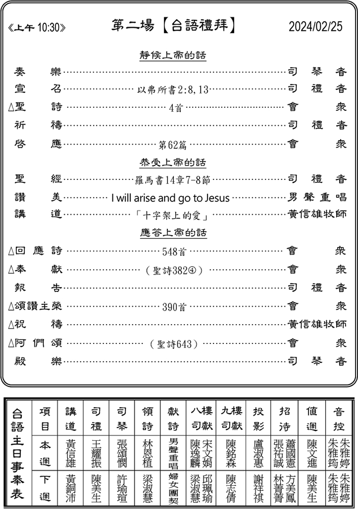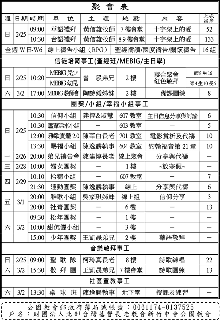 1. 本主日(2/25)台語禮拜後(12:30)於七樓召開復活節讚美禮拜及相關系列活動籌備會議,敬請同工出席。(敬備午餐,請於團體表格登記)