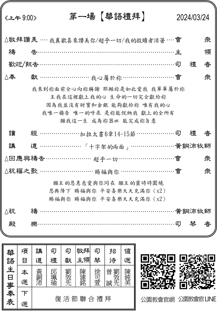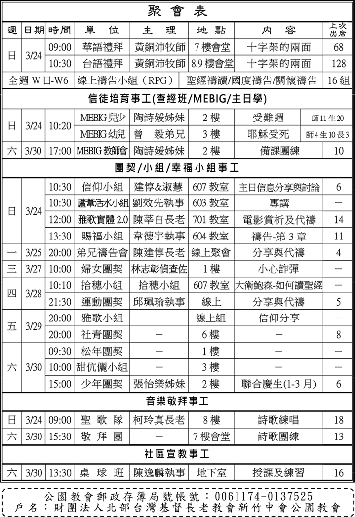- 下週主日(3/31)上午10:00舉行復活節聯合讚美禮拜,聖歌隊+敬拜團聯合詩班讚美,主日學「受難與復活」戲劇。歡迎兄姊參加,一起頌讚並傳揚主耶穌的復活。