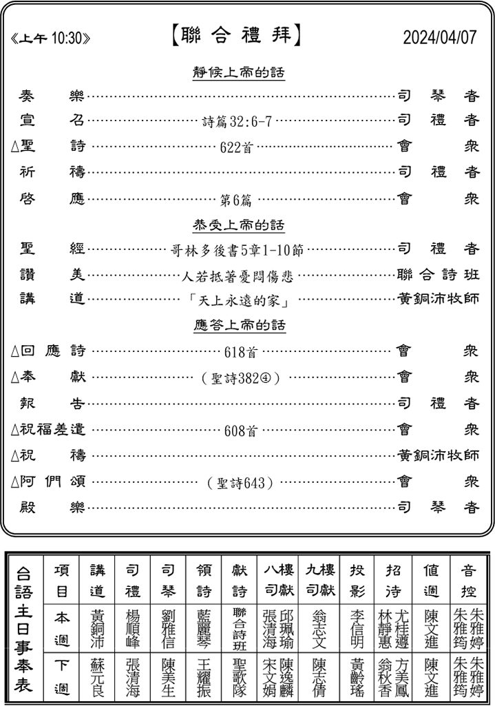 4/21(日) 兩堂禮拜 講道者/黃銅沛牧師