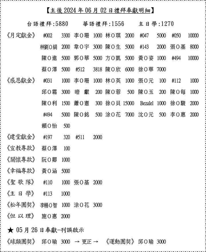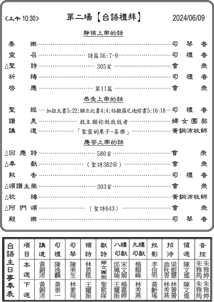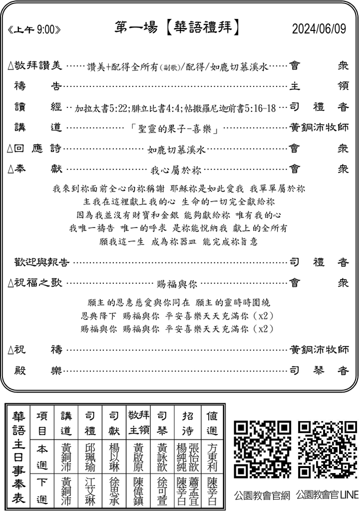 - 本主日(6/9)為端午連假,願上帝賜福保守,闔家平安喜樂。