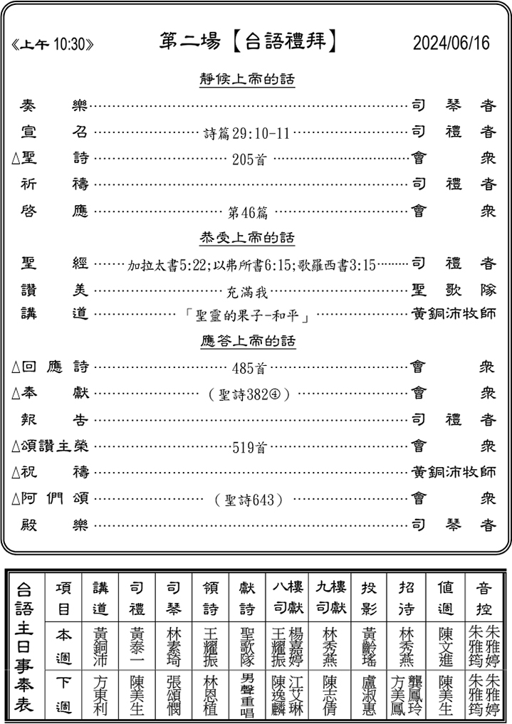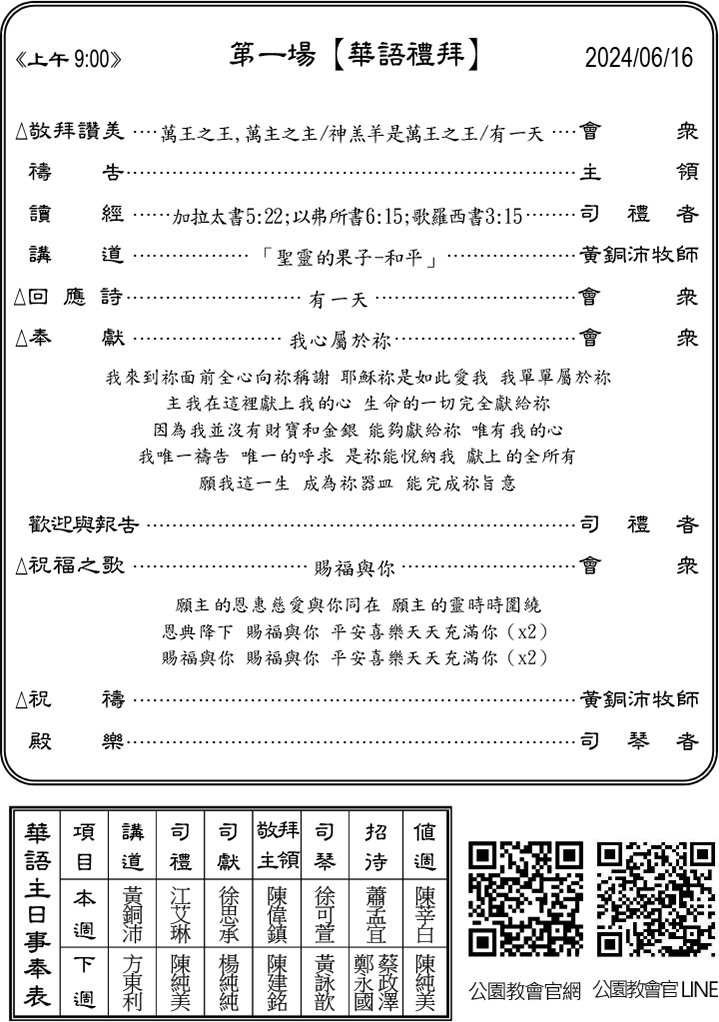 - 近期聖禮典預定7/7(日)兩堂禮拜中舉行,請向幹事室報名,以安排受洗課程。