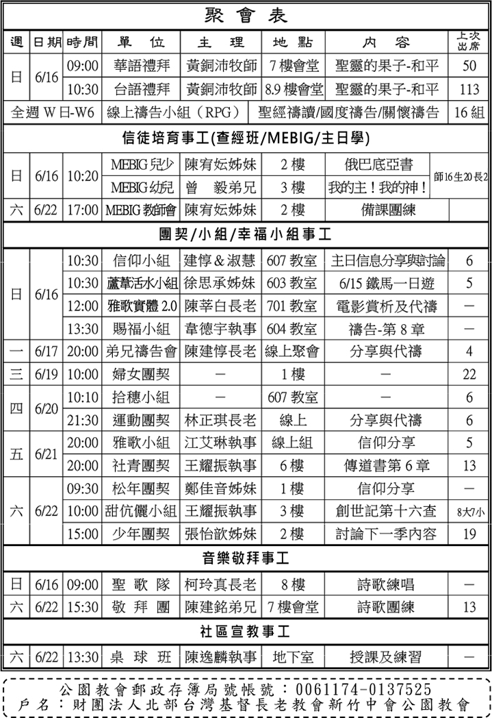 - 總會宣教基金會6/29(六)8:30-16:30舉辦「銀髮桌遊帶領人初階培訓課程」,地點:新竹教會。