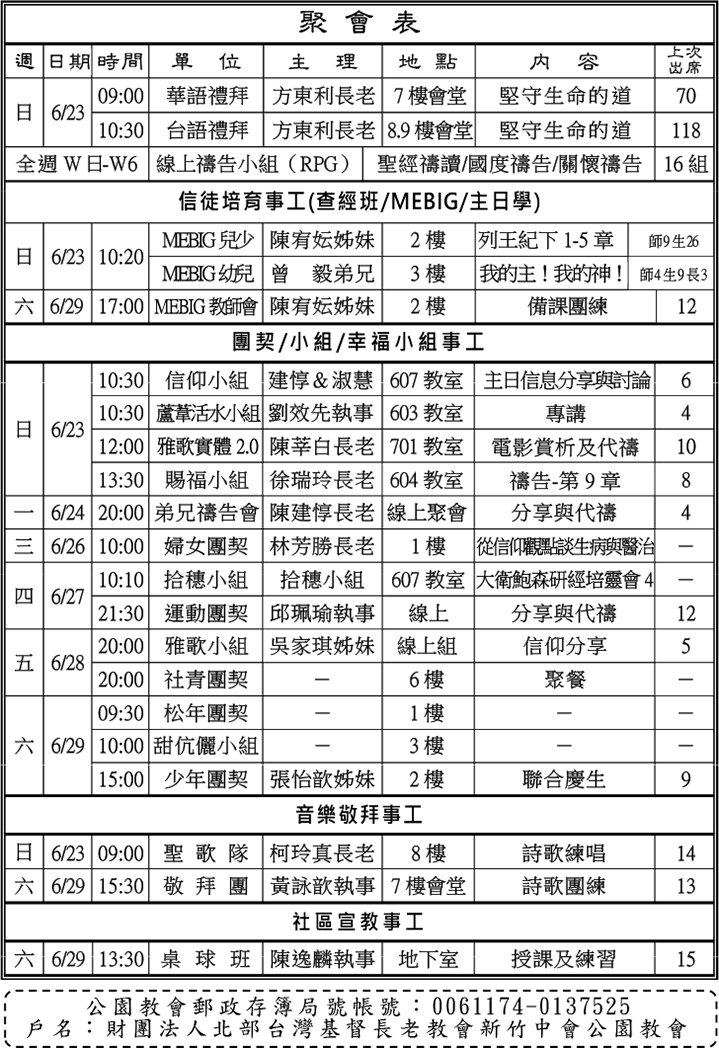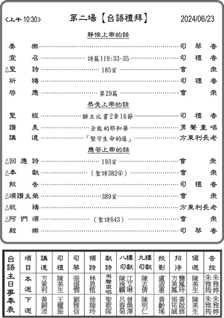 - 本主日(6/23)感謝方東利長老於兩堂禮拜中講道。