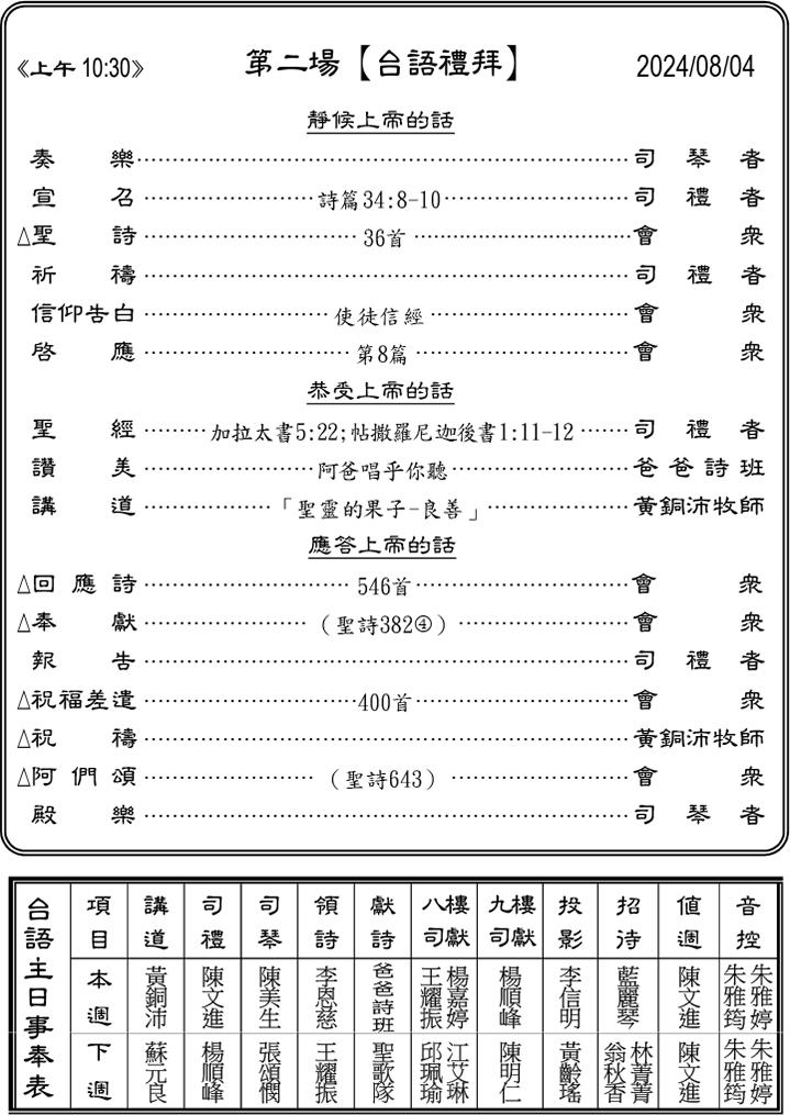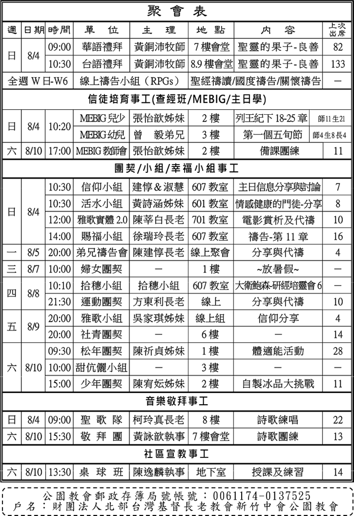 - 本週四(8/8)上午9:30於本會一樓舉行新竹區眾教會聯禱會,由本會主領。