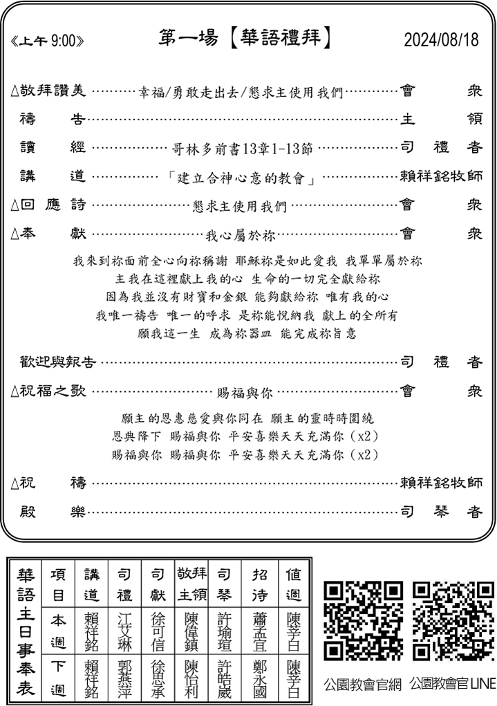 1. 上週主日(8/11)賴祥銘牧師就任教育牧師授職感恩禮拜,感謝眾同工參與服事以及眾兄姊蒞臨參加,成就美好團隊服事。