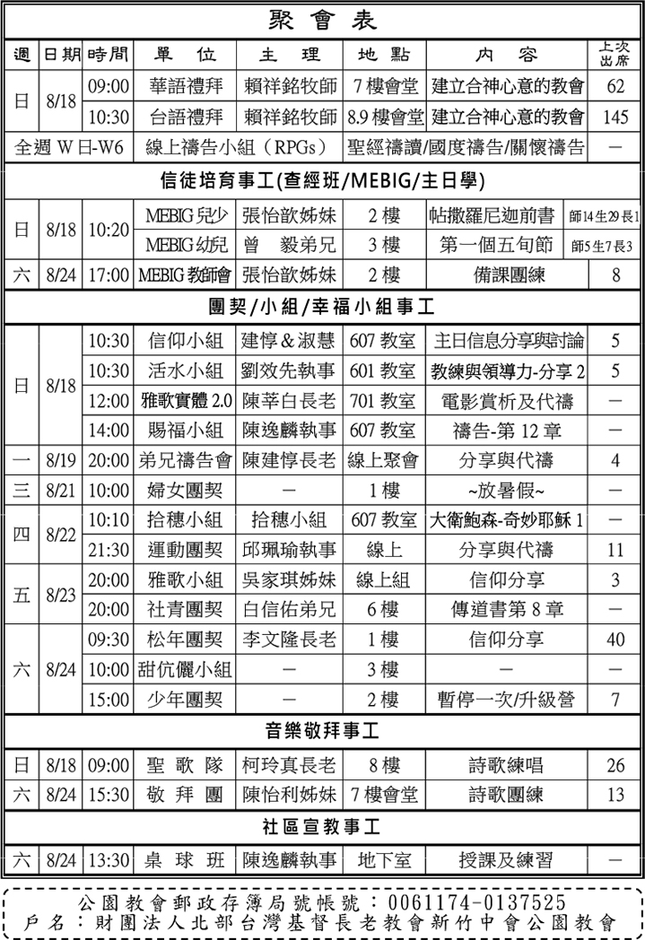 1. 本主日(8/18)歡迎台北中會雙和教會陳惠如牧師率22位師生蒞臨,觀摩本會MEBIG主日學事工。